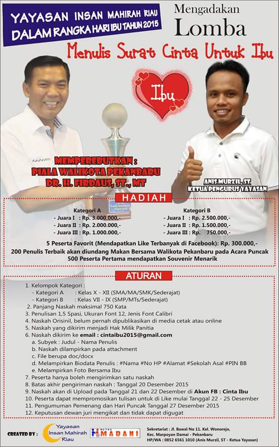 lomba menulis terbaru dalam rangka memperingati hari ibu tahun 2015. Hadiahnya berupa uang tunai dan piala walikota Pekanbaru Dr. H. Firdaus, St. Mt.